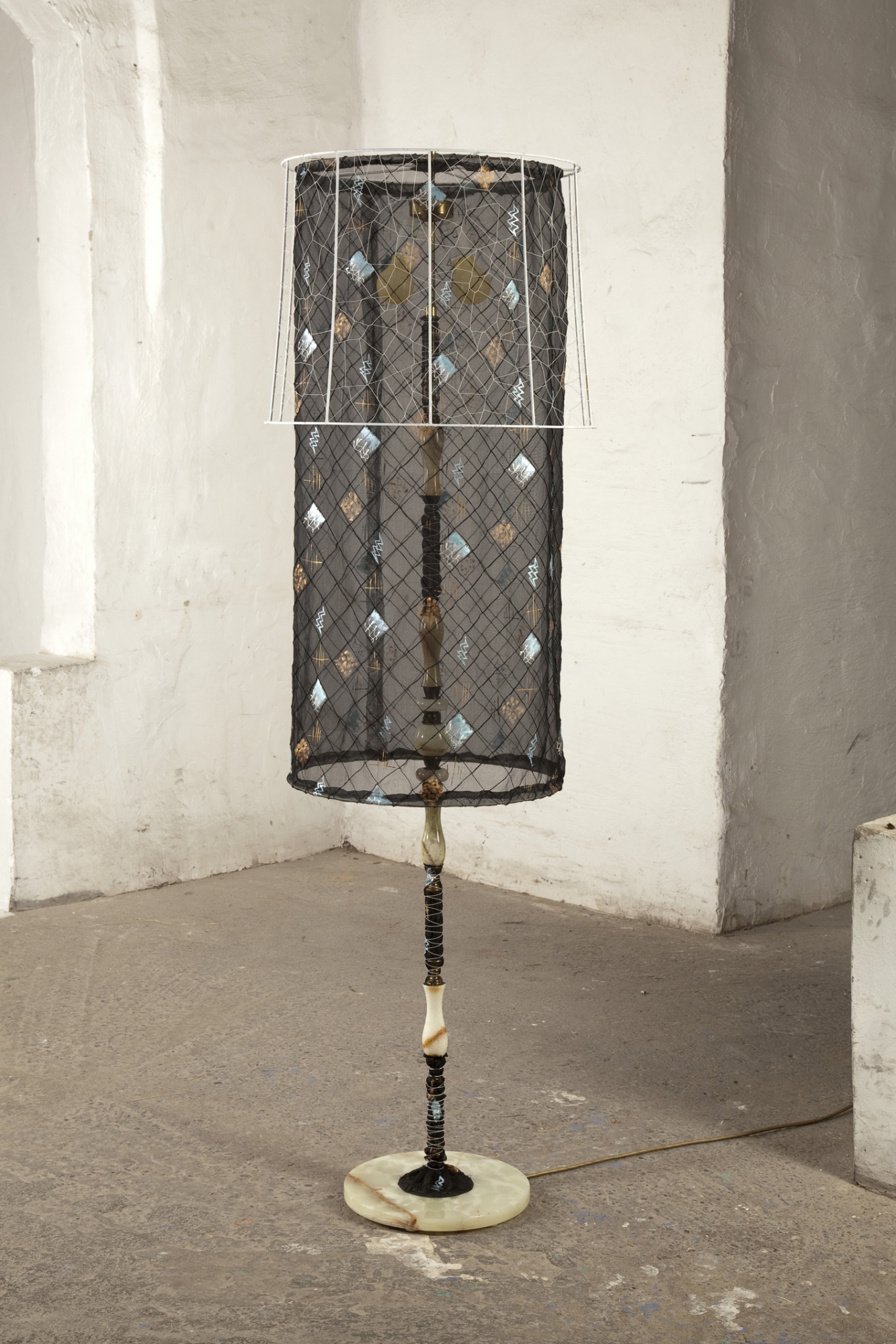 Material: bemalter/ beschriebener Lampenschirm, Holzständer, Stoff