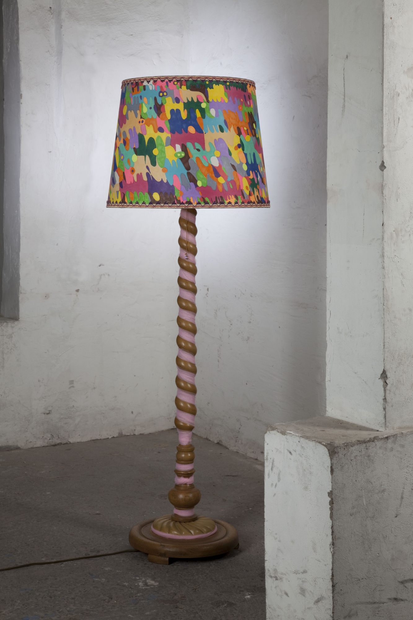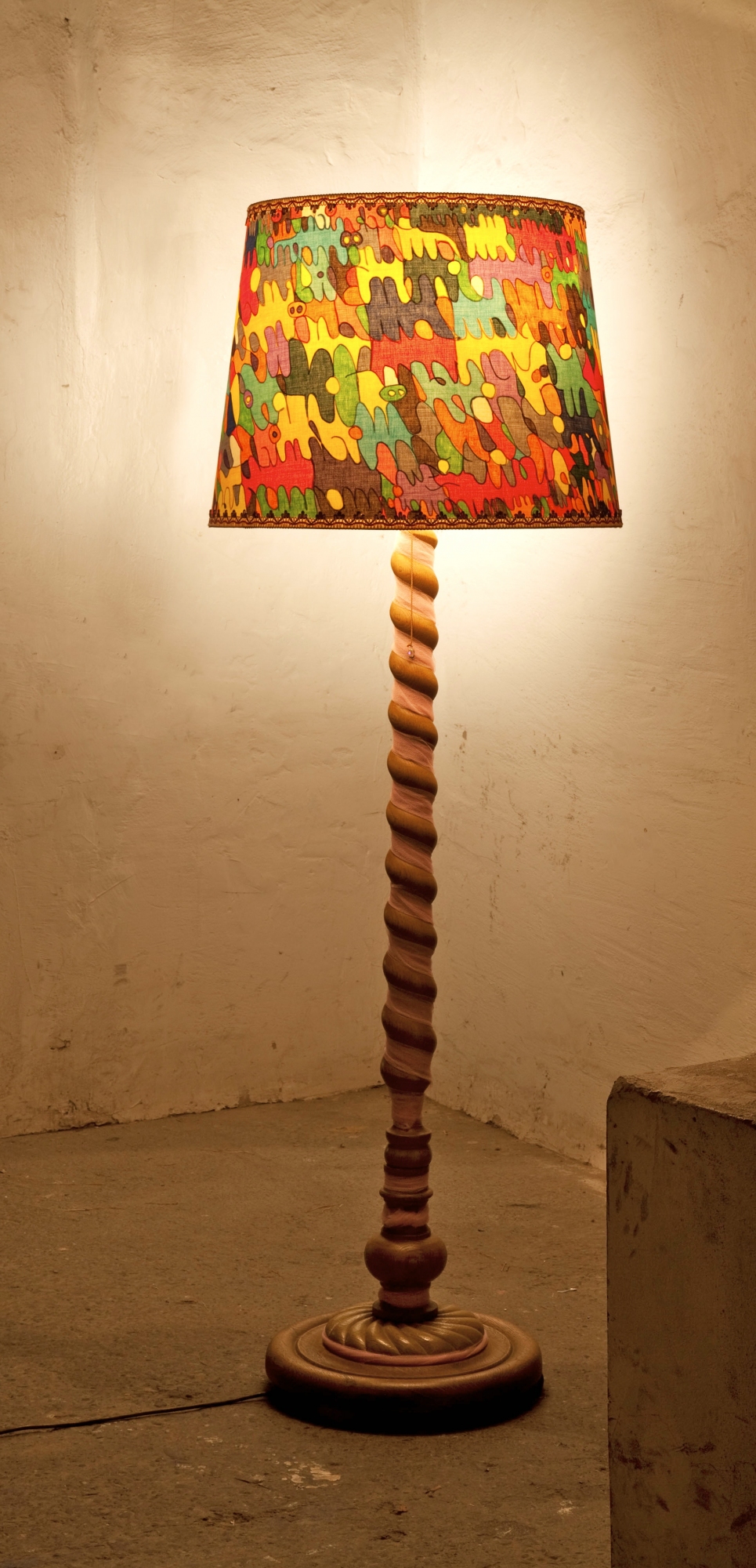 Wer hätte das gedacht? In diesem farbenfrohen Lampenschirm versteckt sich eine aufmüpfige Botschaft aus dem Frauenkalender „Tag für Tag" von 1981, die sich nur in erleuchtetem Zustand zeigt: "negnärdfau fualsnebeL neniek rim, negnäwz nemroF ni thcin hcim ssal hci, nebürt thcin kcilB neniem rim ssal hci, nebü tumeD ni thcin hcim lliw hcI". Richtig gelesen, ergibt das Kauderwelsch einen ganz eigenen Sinn.